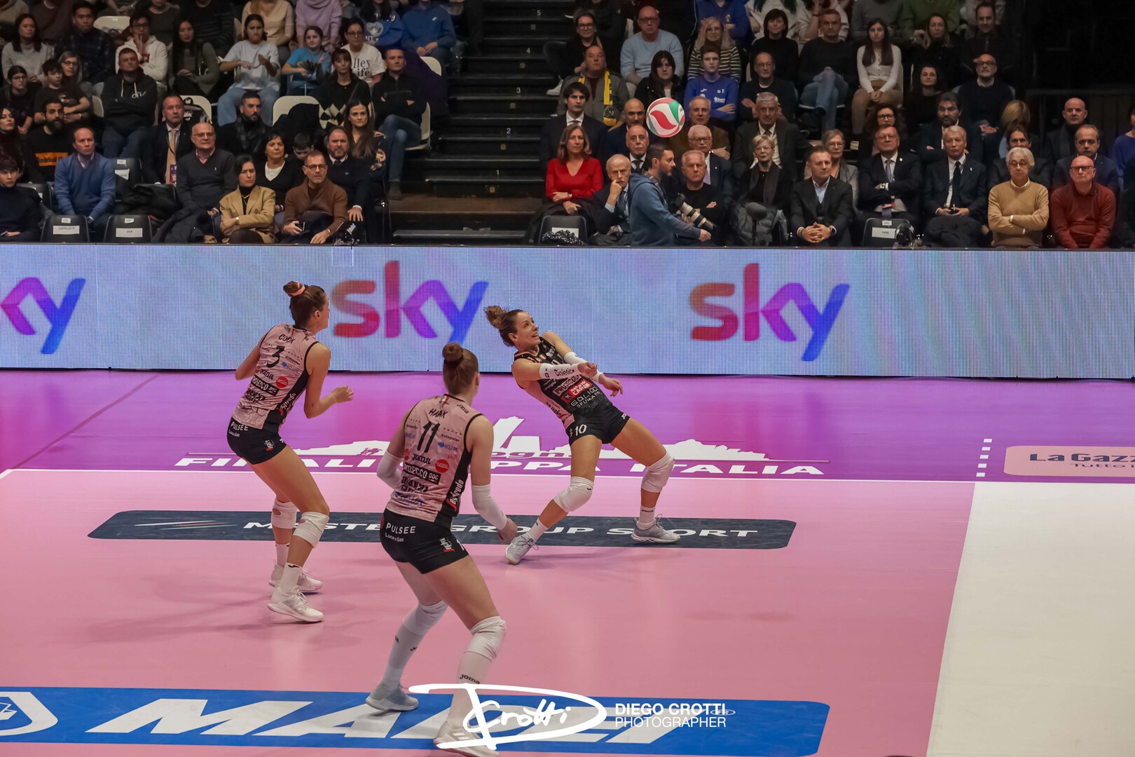 Parte subito forte Milano 0-3, Robinson ricuce con due punti per il 2-3, poi magia di Wolosz e spike di Haak per il 4-4. Sylla e un gran pallonetto di Stevanovic portano sul 5-6 le milanesi, poi Plummer ancora Haak lanciano la prima mini fuga di Conegliano sul 10-7. L’opposta svedese continua a martellare anche dal servizio: doppio ace, 14-9 e timeout Gaspari. Thompson risponde da campionessa al ritorno sul taraflex per il 16-12 con tre punti di fila. Ma sempre Haak, evidentemente chiamata in causa, risponde dall’altro lato con un paio di bordate e porta le sue sul 19-12. Stevanovic prova a riportare in gioco le milanesi, ma Cook con due punti regala a Conegliano il primo set per 25-17. Milano riparte con il piede sull’acceleratore nella seconda frazione, con Thompson ancora protagonista nel 3-5 iniziale, ma le pantere tornano in parità sul 6-6 con Plummer. Ancora l’opposta americana (9 punti nel set), insieme all’ex Sylla (6-8) protagoniste di un paio di grandi giocate, ma le gialloblu tornano di nuovo in parità sul 10-10. Il set prosegue sul filo del rasoio, punto su punto, con Milano che sembra poter tentare di riaprire la sfida. Ma nel finale, le energie delle pantere sono maggiori e permettono il 2-0 sul 25-23. Nel terzo set, dopo la pausa lunga e la performance dei Disco Club Paradiso, parte forte Conegliano, che va subito sul 6-1 che costringe al timeout coach Gaspari. Il gap si mantiene importante, le pantere vanno più forte e salvano ogni pallone: il distacco in campo è più ampio più di quanto non dica il 25-19 finale, che regala l’ennesima gioia alle gialloblu.